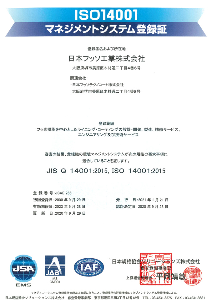 In 2004, NIPPON FUSSO was certified by integrated audit of ISO 9001 and ISO14001 at our major domestic business locations (headquarters, Main Plant, Minami Osaka Plant, Saitama Plant, etc).